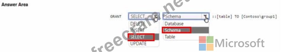 You have an Azure subscription that contains a group named Group1 and an Azure SQL managed instance that hosts a database named 081. You need to ensure that Group 1 has read access to new tables created m 06I The solution must use the principle of least privilege How should you complete the Transact-SQL statement' To answer, select the appropriate options in the answer are a. NOTE: Each correct selection is worth one point.