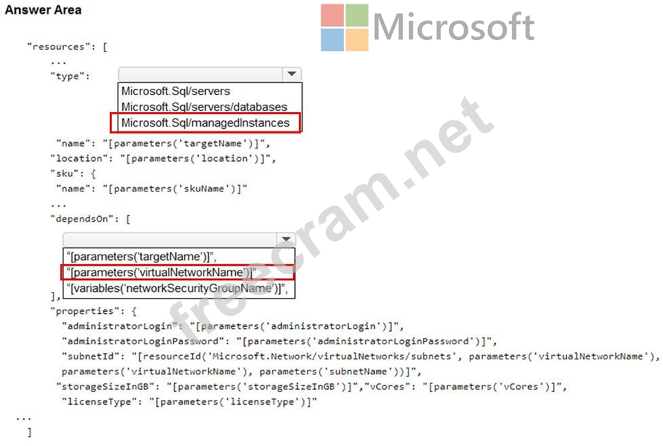 How should you complete the ARM template? To answer, select the appropriate options in the answer area.