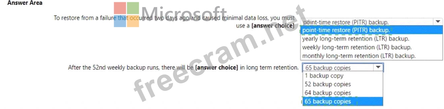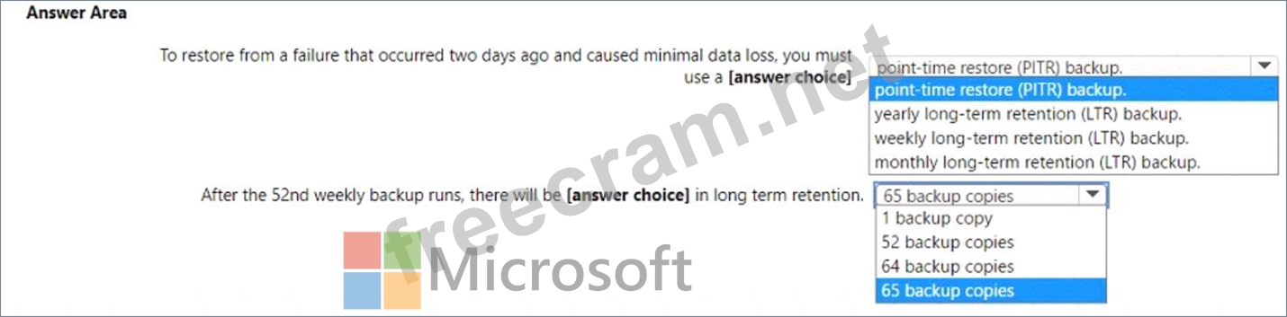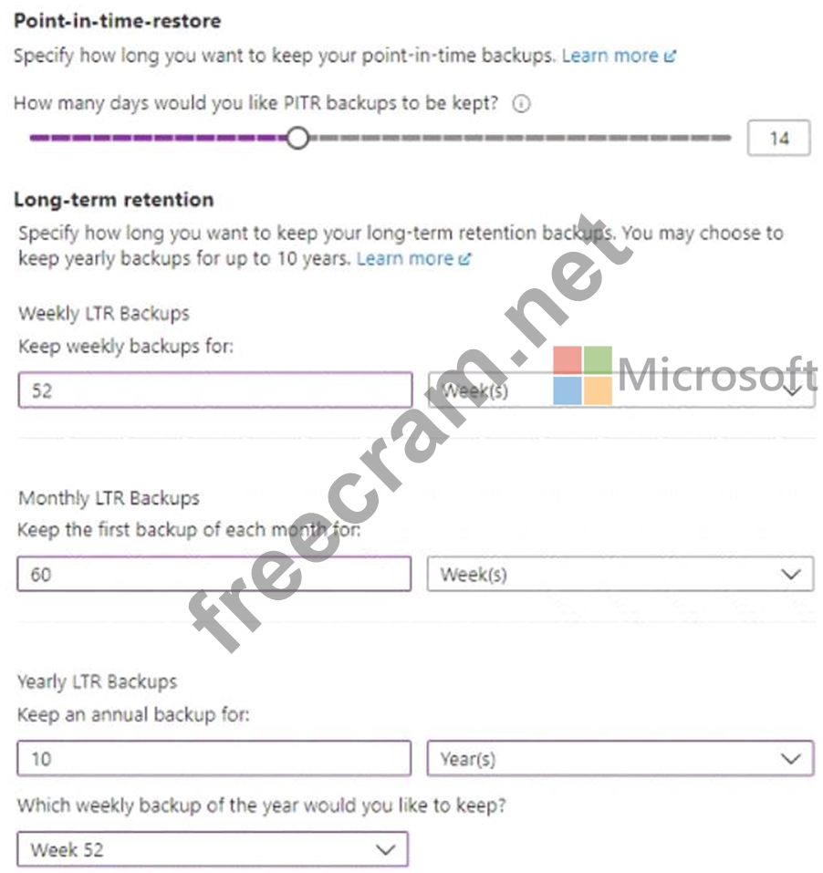 Question 116: You configure backups for an Azure SQL database as shown in ...