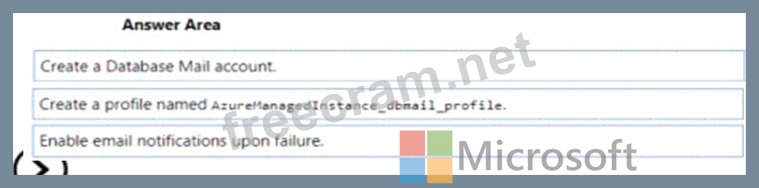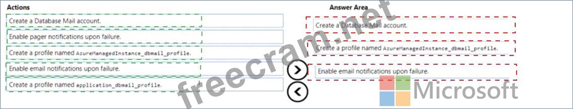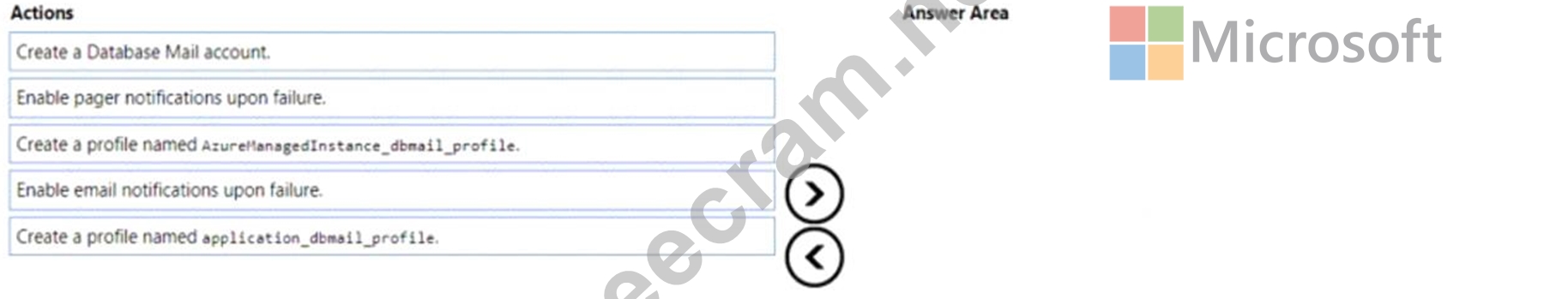 You create a new Azure SQL managed instance named SQL1 and enable Database Mail extended stored You need to ensure that SQ Server Agent jobs running on SQL 1 can notify when a failure Occurs Which three actions should you perform in sequence 7 TO answer. move the appropriate actions from the list Of actions to answer area and arrange them in correct order.