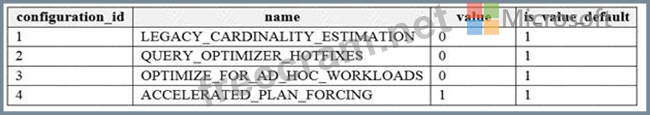 You run the select * from sys.database_scoped_configurations Transact-SQL command and receive the results shown in the following table.