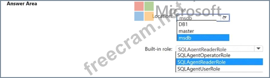 Which built-in database role should you assign to User1, and where is the role defined? To answer, select the appropriate options in the answer area.