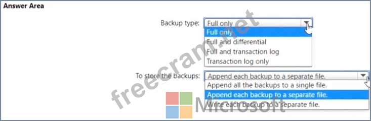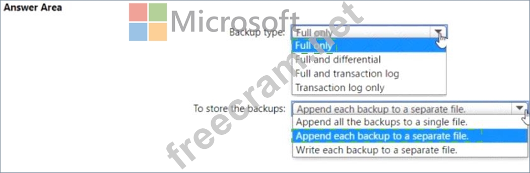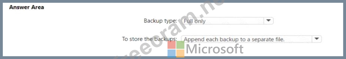 Which type of backups should you create, and how should you store the backups? To answer, select the appropriate options in the answer area.