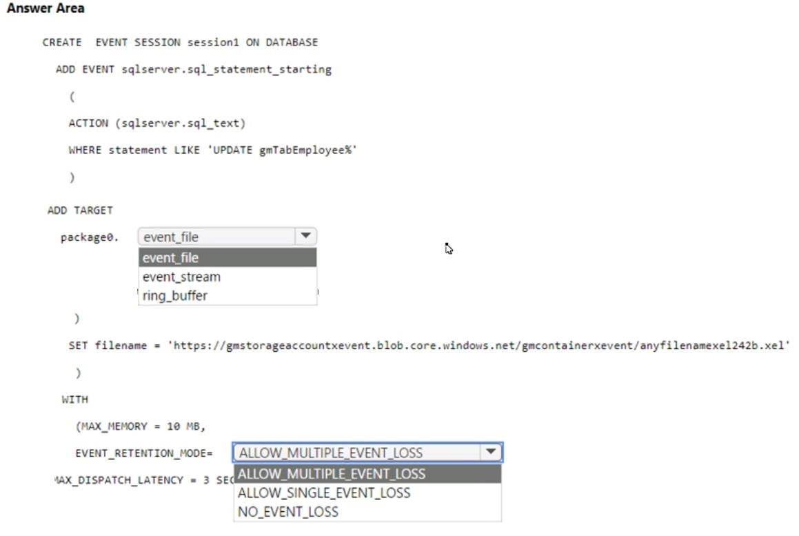 You have an Azure subscription that contains an instance of SQL Server on Azure Virtual Machines. The virtual machine hosts a database named DB1. You need to monitor DB1 by using Extended Events. The solution must meet the following requirements: