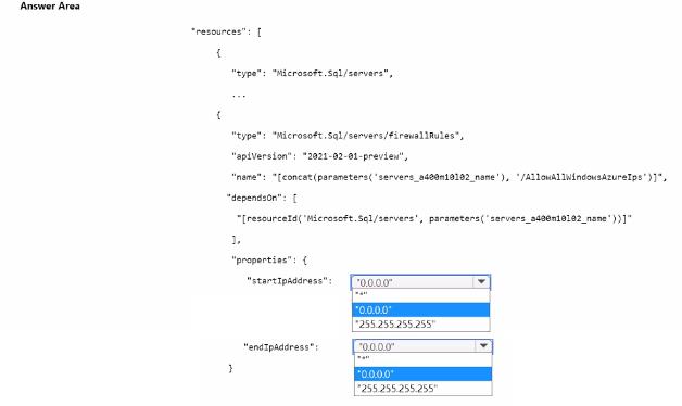 You need to deploy a logical SQL server by using an Azure Resource Manager (ARM) template. The solution must ensure that the server will allow inbound connectivity from any Azure resource.