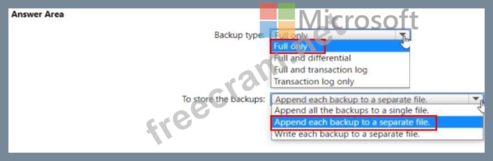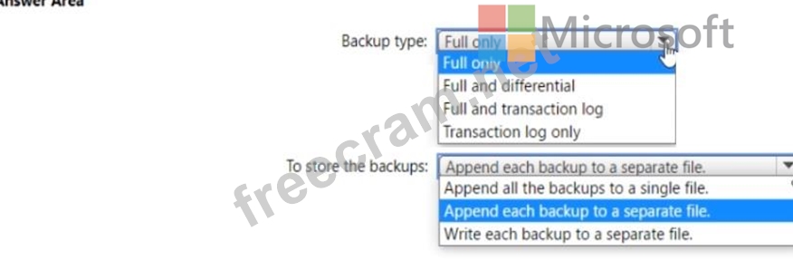 Which type of backups should you create, and how should you store the backups? To answer, select the appropriate options in the answer area.