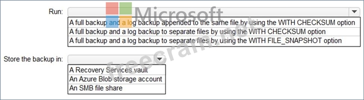 What should you run for the backup and where should you store the backup? To answer, select the appropriate options in the answer area.