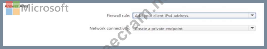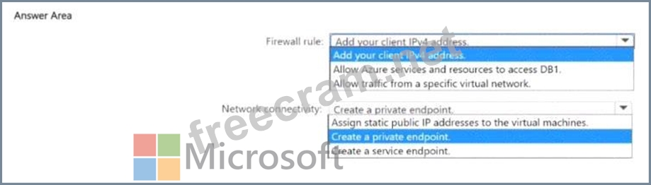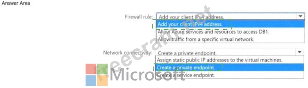 How should you configure the firewall rule, and how should you establish network connectivity from the virtual machines to DB1? To answer, select the appropriate options in the answer area.