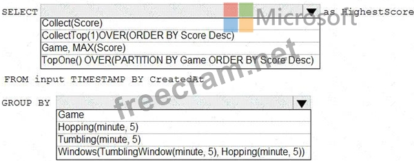 TopOne() OVER ([<PARTITION BY clause>] ORDER BY (<column name> [ASC |DESC])+ <LIMIT DURATION clause> [<WHEN clause>]) Box 2: Tumbling(minute 5) Tumbling window functions are used to segment a data stream into distinct time segments and perform a function against them, such as the example below. The key differentiators of a Tumbling window are that they repeat, do not overlap, and an event cannot belong to more than one tumbling window.