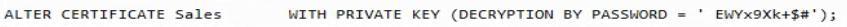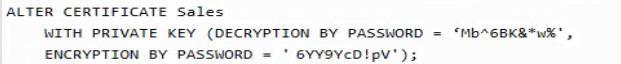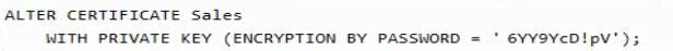 You have an Azure SQL database named DB1 that contains a private certificate named Sales. The private key for Sales is encrypted with a password. You need to change the password for the private key. Which Transact-SQL statement should you run?