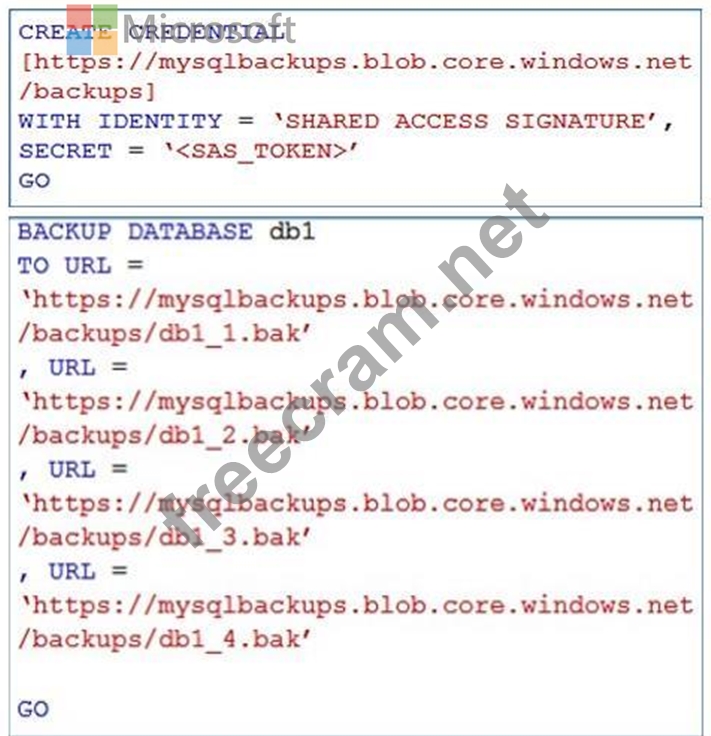 You need to back up db1 to mysqlbackups, and then restore the backup to a new database named db2 that is hosted on SQL1. The solution must ensure that db1 is backed up to a stripe set.