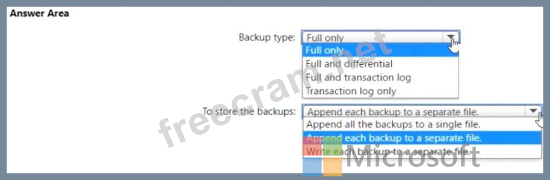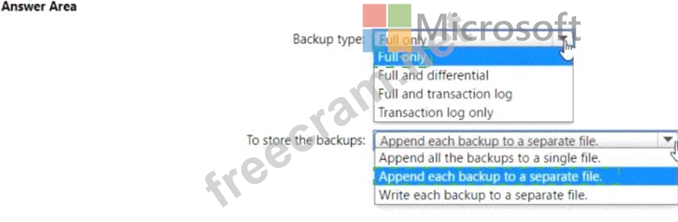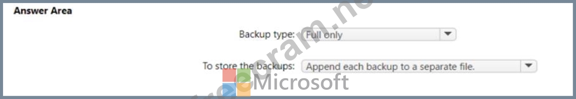 Which type of backups should you create, and how should you store the backups? To answer, select the appropriate options in the answer area.