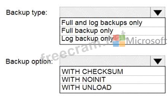 How should you configure the backup of DB1? To answer, select the appropriate options in the answer area.