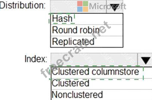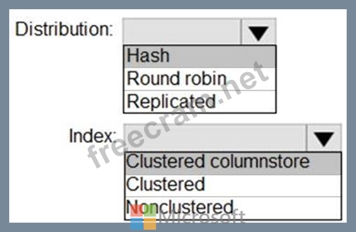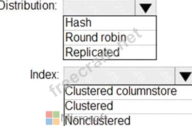 You need to recommend which distribution type and index type to use for the table. The solution must provide the fastest query performance.