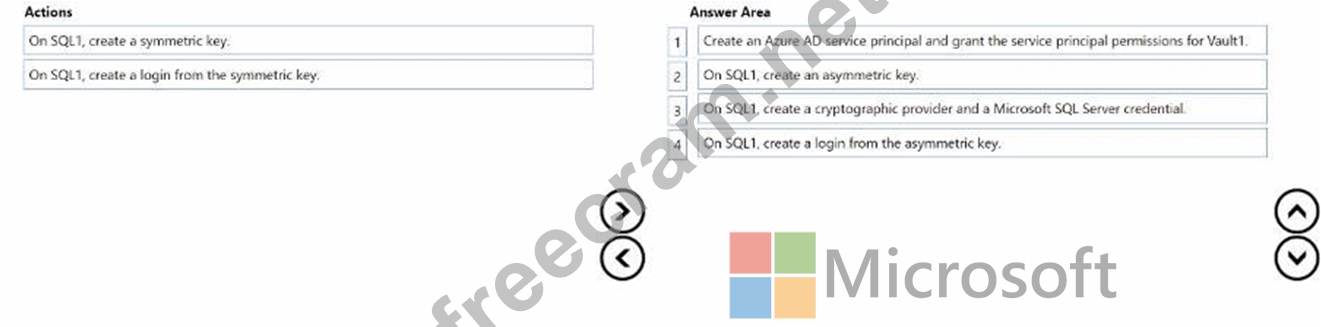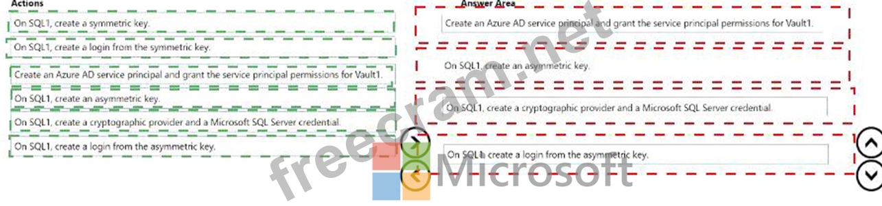 You need to configure Transparent Data Encryption (TDE) on D61 to use a key in Vault1 Which four actions should you perform in sequence' To answer, move the appropriate actions from the list of actions to the answer area and arrange them in the correct order.
