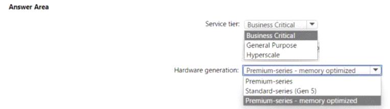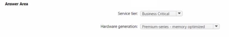 Which service tier and hardware generation should you use? To answer, select the apocopate options in the answer area.