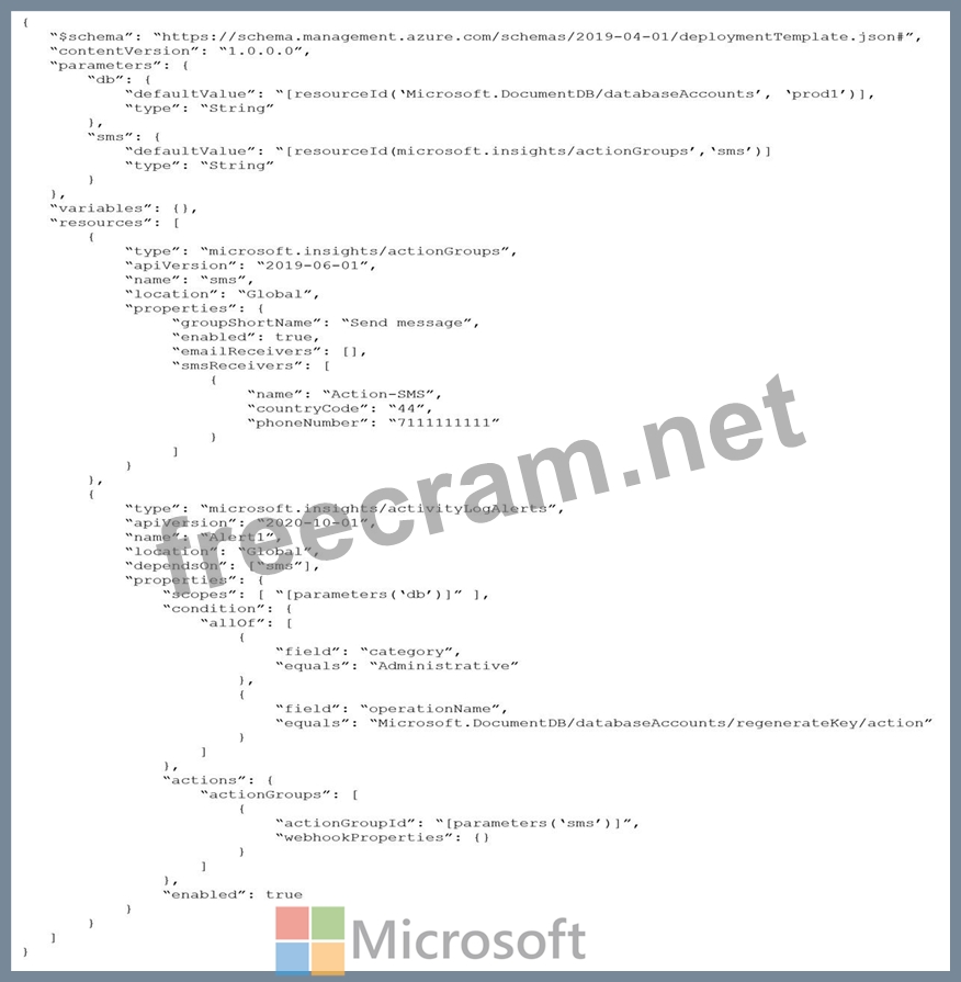 You provision Azure resources by using the following Azure Resource Manager (ARM) template.