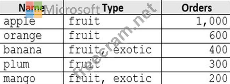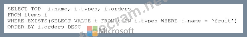 You are developing an application that will use an Azure Cosmos DB Core (SQL) API account as a data source. You need to create a report that displays the top five most ordered fruits as shown in the following table. A collection that contains aggregated data already exists. The following is a sample document: { "name": "apple", "type": ["fruit", "exotic"], "orders": 10000 } Which two queries can you use to retrieve data for the report? Each correct answer presents a complete solution. NOTE: Each correct selection is worth one point. A) B) C) D)