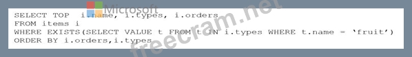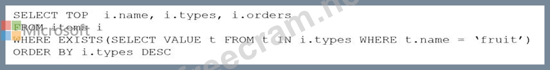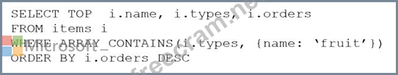 ARRAY_CONTAINS returns a Boolean indicating whether the array contains the specified value. You can check for a partial or full match of an object by using a boolean expression within the command. Incorrect Answers: A: Default sorting ordering is Ascending. Must use Descending order. C: Order on Orders not on Type.
