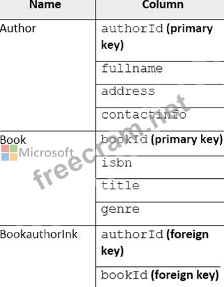 You maintain a relational database for a book publisher. The database contains the following tables. The most common query lists the books for a given authorId. You need to develop a non-relational data model for Azure Cosmos DB Core (SQL) API that will replace the relational database. The solution must minimize latency and read operation costs. What should you include in the solution?