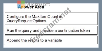 You have an app that stores data in an Azure Cosmos DB Core (SQL) API account The app performs queries that return large result sets. You need to return a complete result set to the app by using pagination. Each page of results must return 80 items. Which three actions should you perform in sequence? To answer, move the appropriate actions from the list of actions to the answer area and arrange them in the correct order.