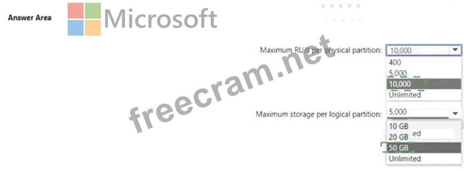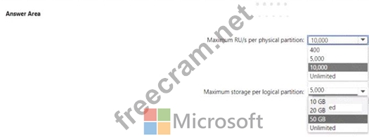 What are the partition limits for request units per second (RU/s) and storage? To answer, select the appropriate options in the answer area.