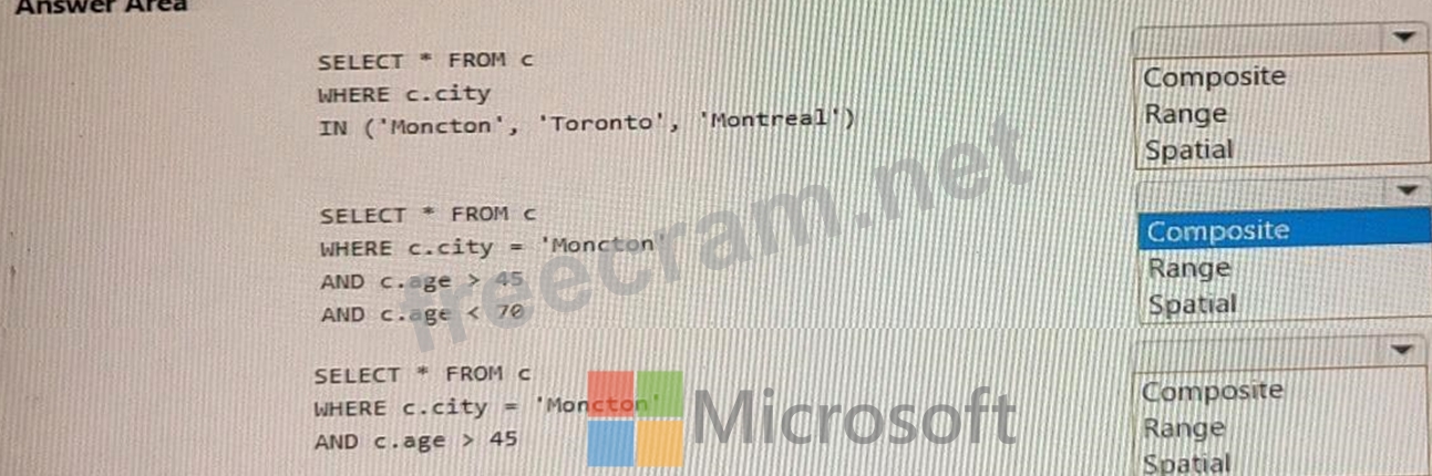 Box 1 = Range Azure Cosmos DB supports three types of indexes: range, spatial and composite. For the query you provided, which is an equality query on a single property, the best type of index to use is range. Range index is based on an ordered tree-like structure and it is used for equality queries, range queries and checking for the presence of a property1. Range index also supports any string or number .