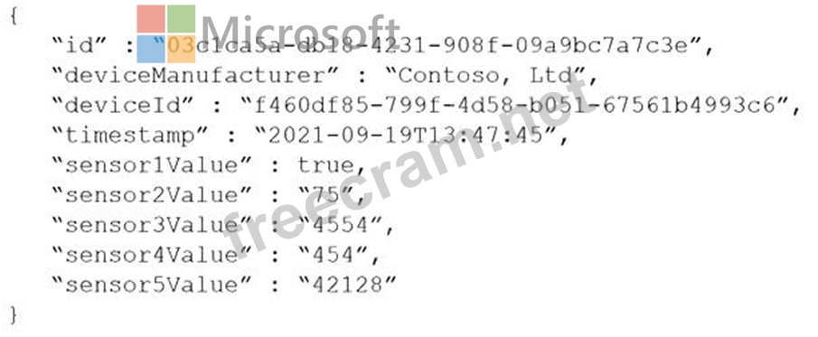 You are designing an Azure Cosmos DB Core (SQL) API solution to store data from IoT devices. Writes from the devices will be occur every second. The following is a sample of the data. You need to select a partition key that meets the following requirements for writes: Minimizes the partition skew Avoids capacity limits Avoids hot partitions What should you do?