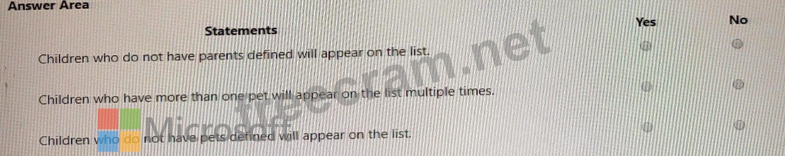 Children who have more than one pet will appear on the list multiple times. = Yes Children who have more than one pet will appear on the list multiple times. This is because the document schema defines the pets property as an array of objects that contain the givenName and type properties of each pet, as well as a children property that references the id values of the children who own the pet. If a child has more than one pet, it means that the child's id value will appear in the children property of multiple pet objects. Therefore, such a child will be included in the list of children who have pets multiple times.