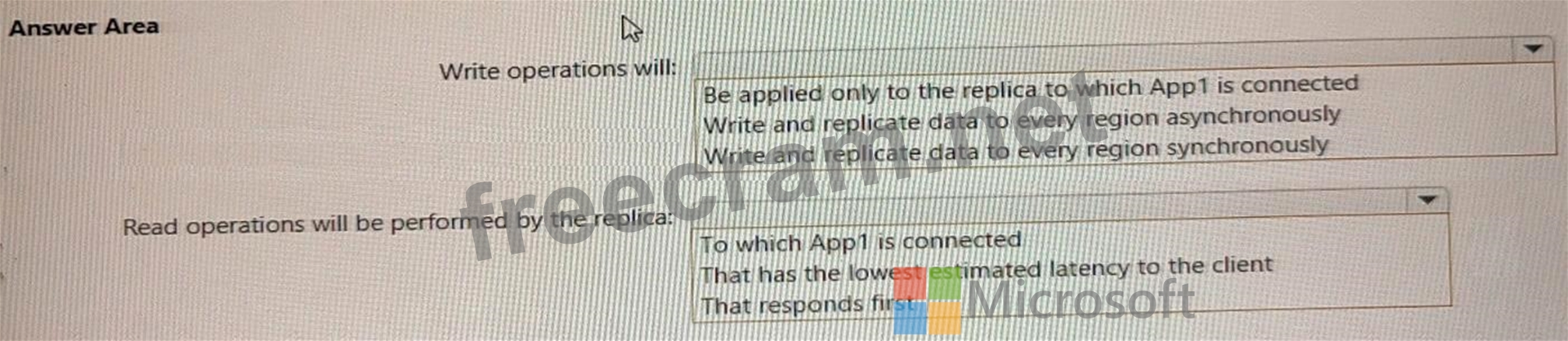 This is because the write concern is mapped to the default consistency level configured on your Azure Cosmos DB account2, which is strong in this case. Strong consistency ensures that every write operation is synchronously committed to every region associated with your Azure Cosmos DB account1. The request level consistency level of session only applies to the read operations of App11.