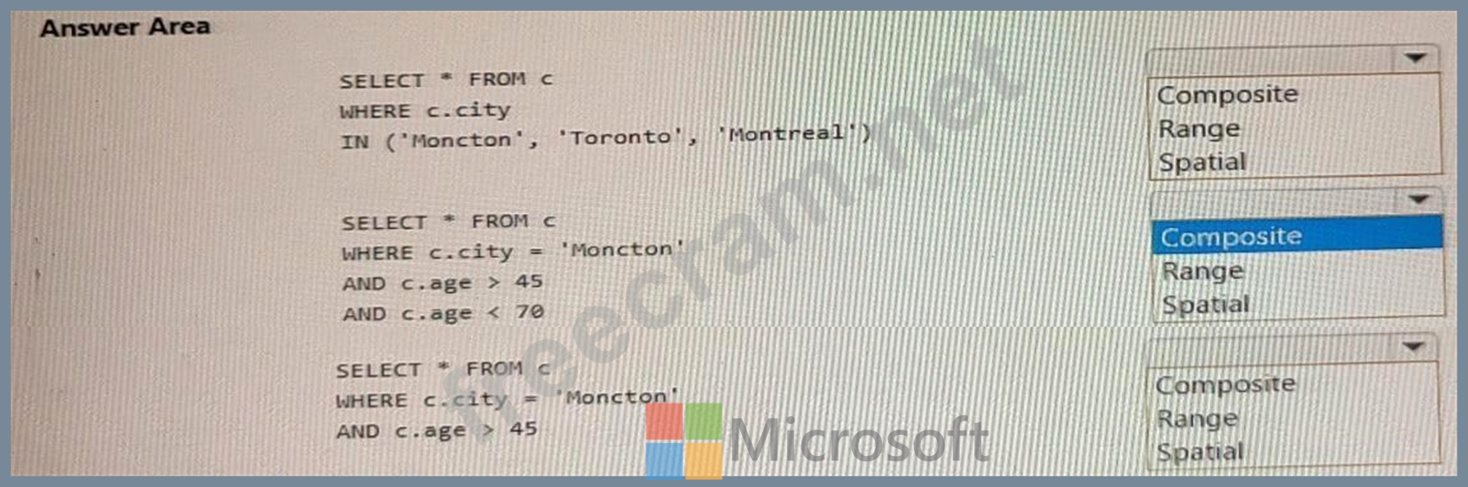 Which type of index should you use for each query? To answer, select the appropriate options in the answer area.