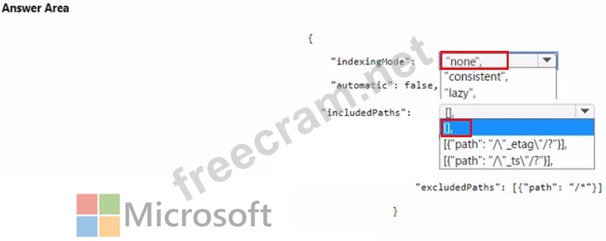 How should you complete the JSON definition of the indexing policy? To answer, select the appropriate options in the answer area.