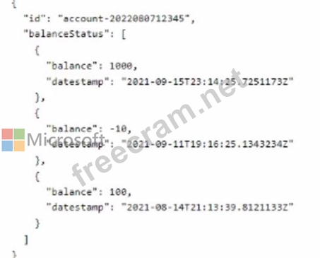 You plan to create an Azure Cosmos DB container named account that will contain items in the following format.