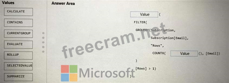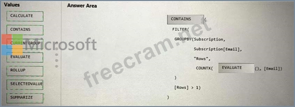 How should you complete the DAX expression? To answer, drag the appropriate values to the targets. Each