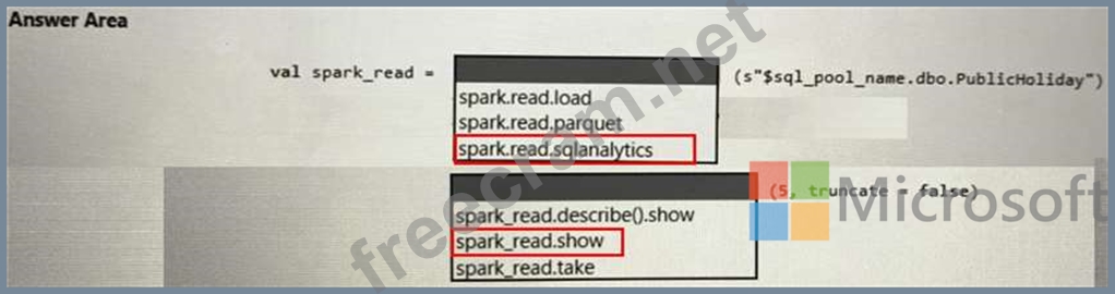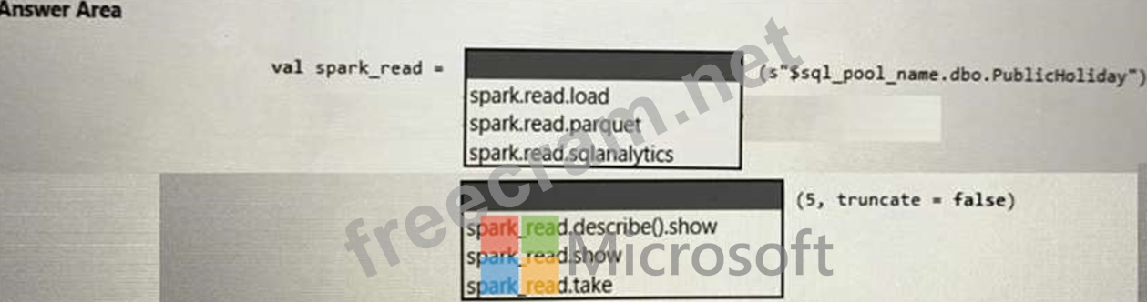 You need to use PySpark in a notebook to read data from a SQL pool as an Apache Spark DataFrame and display the top five How should you complete the code? To answer, select the appropriate options in the answer area.