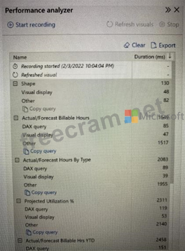 You open Performance analyzer, start recording, and refresh the visuals on the page. The recording produces