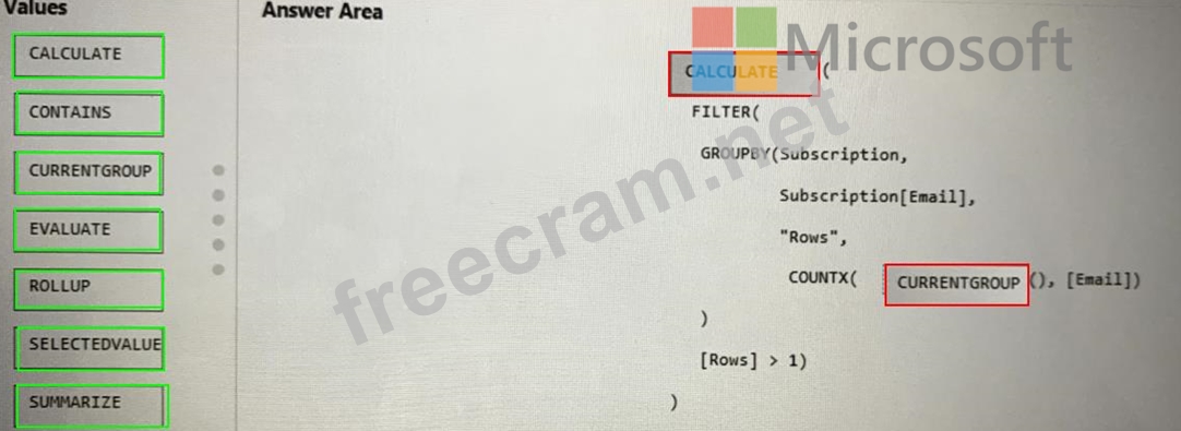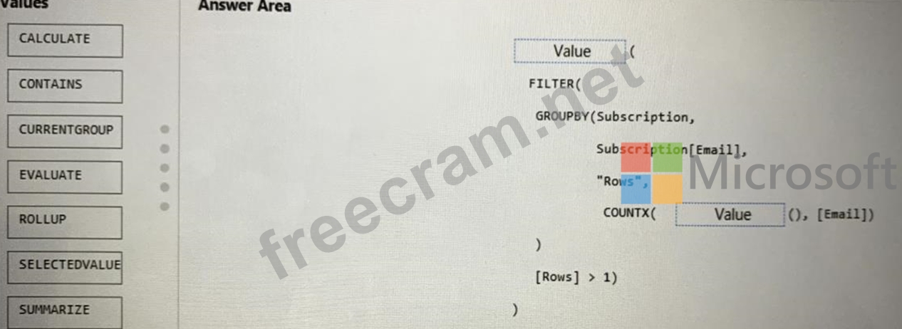 How should you complete the DAX expression? To answer, drag the appropriate values to the targets. Each value may be used once, more than once. may need to drag the split bar between panes or scroll to view content.