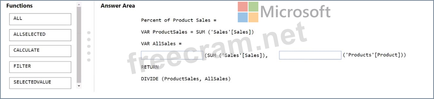 How should you complete the measure? To answer, drag the appropriate DAX functions to the correct targets. Each function may be used once, more than once, or not at all. You may need to drag the split bar between panes or scroll to view content.