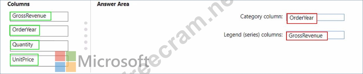 How should you populate the chart? To answer, drag the appropriate columns to the correct settings. Each column may be used once, more than once, or not at all. You may need to drag the split bar between panes or scroll to view content.
