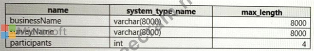You are using an Azure Synapse Analytics serverless SQL pool to query a collection of Apache Parquet files by using automatic schema inference. The files contain more than 40 million rows of UTF-8-encoded business names, survey names, and participant counts. The database is configured to use the default collation.