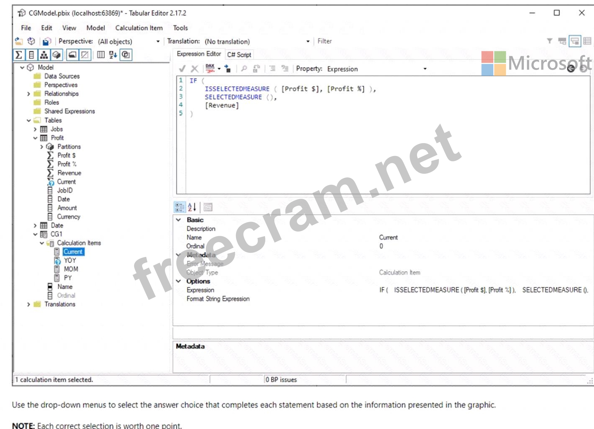 You have a Power BI report and dataset in Power BI Desktop. The dataset contains a calculation group named CG1 that contains four calculation items. The Current calculation item is shown in the following exhibit.