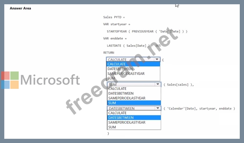 You need to create a DAX measure that returns the year-to-date total sales from the same date from the previous calendar year.