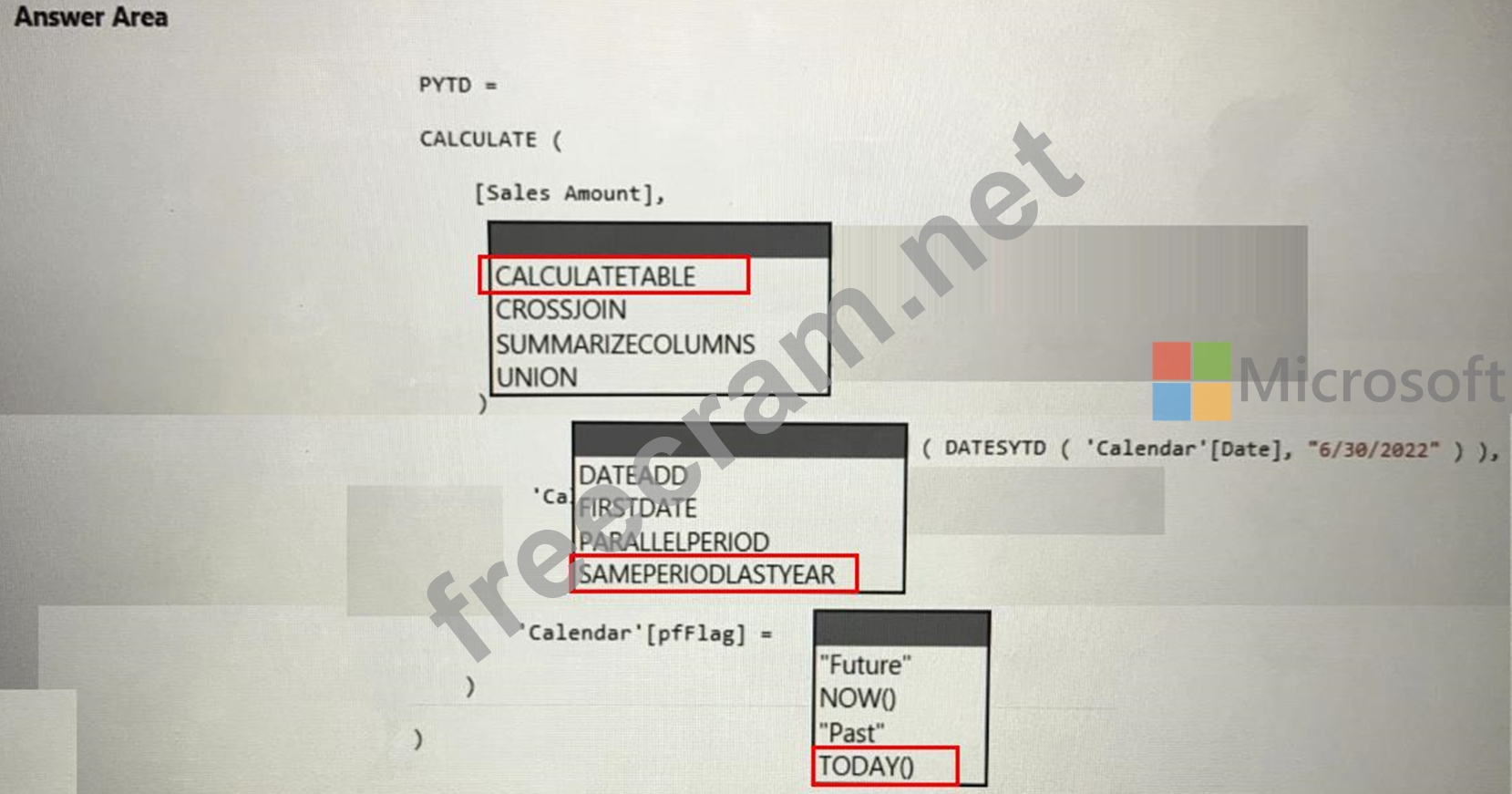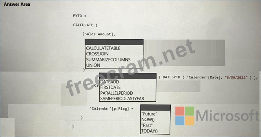 How should you complete the DAX expression? To answer, select the appropriate options in the answer area.