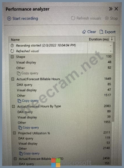You open a Power Bl Desktop report that contains an imported data model and a single report page. You open Performance analyzer, start recording, and refresh the visuals on the page. The recording produces the results shown in the following exhibit What can you identify from the results?