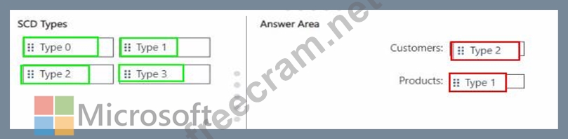 Which type of SCD should you use for each table? To answer, drag the appropriate SCD types to the correct tables. Each SCD type may be used once, more than once, or not at all. You may need to drag the split bar between panes or scroll to view content.