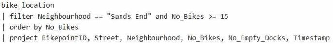 You need to apply transformation and filter logic to prepare the data for consumption. The solution must return data for a neighbourhood named Sands End when No_Bikes is at least 15. The results must be ordered by No_Bikes in ascending order.