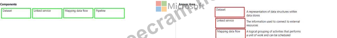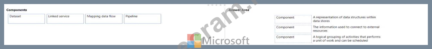 match the Azure data factory components to the appropriate descriptions. To answer, drag the appropriate component from the column on the left to its description on the right. Each component may be used once, more than once, or not at all. NOTE: Each correct match is worth one point.
