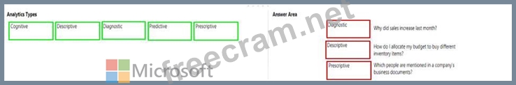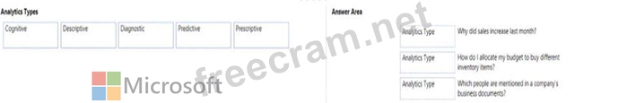 Match the types of analytics that can be used to answer the business questions. To answer, drag the appropriate analytics type from the column on the left to its question on the right. Each analytics type may be used once, more than once, or not at all. NOTE: Each correct match is worth one point.