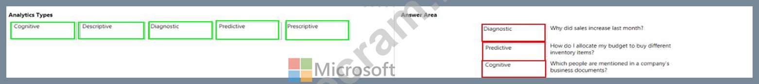 To answer, drag the appropriate analytics type from the column on the left to its question on the right. Each analytics type may be used once, more than once, or not at all.