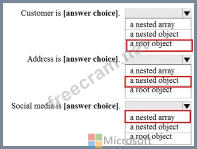 Question 57: You have the following JSON document. (Exhibit) Use the drop...